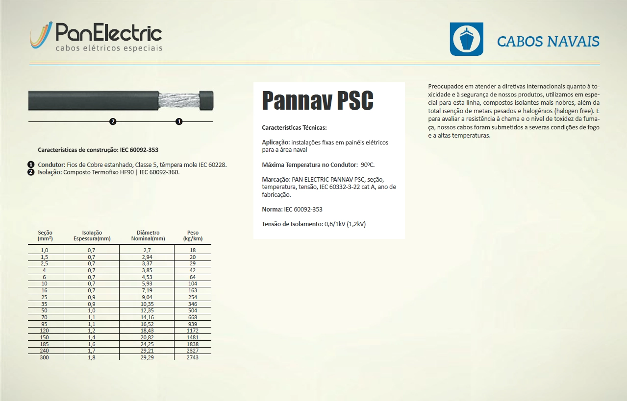 • Marcação: PAN ELECTRIC PANNAV PSC, seção, temperatura, tensão, IEC 60332- 3-22 cat A, , ano de fabricação.