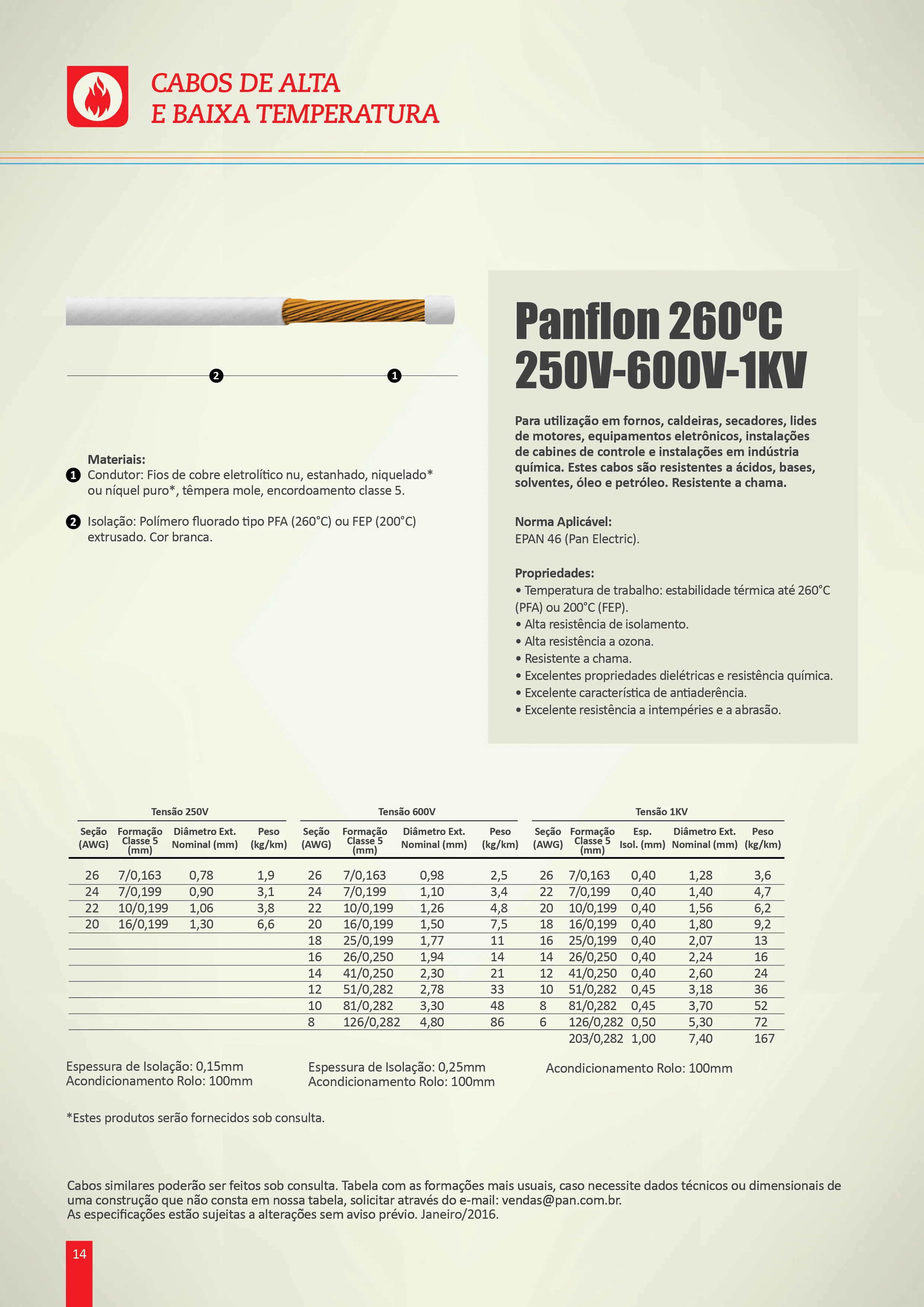 - Isolação: Polímero fluorado tipo PFA (260ºC) ou FEP (200° C)extrusado.